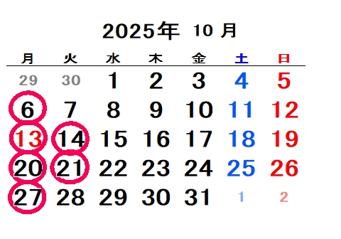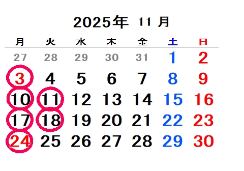 定休日 毎週月曜日 第2・3(月)(火)曜日 令和7年10月の定休日 令和7年11月の定休日 〇が定休日です 営業時間 AM9:00〜PM7:00